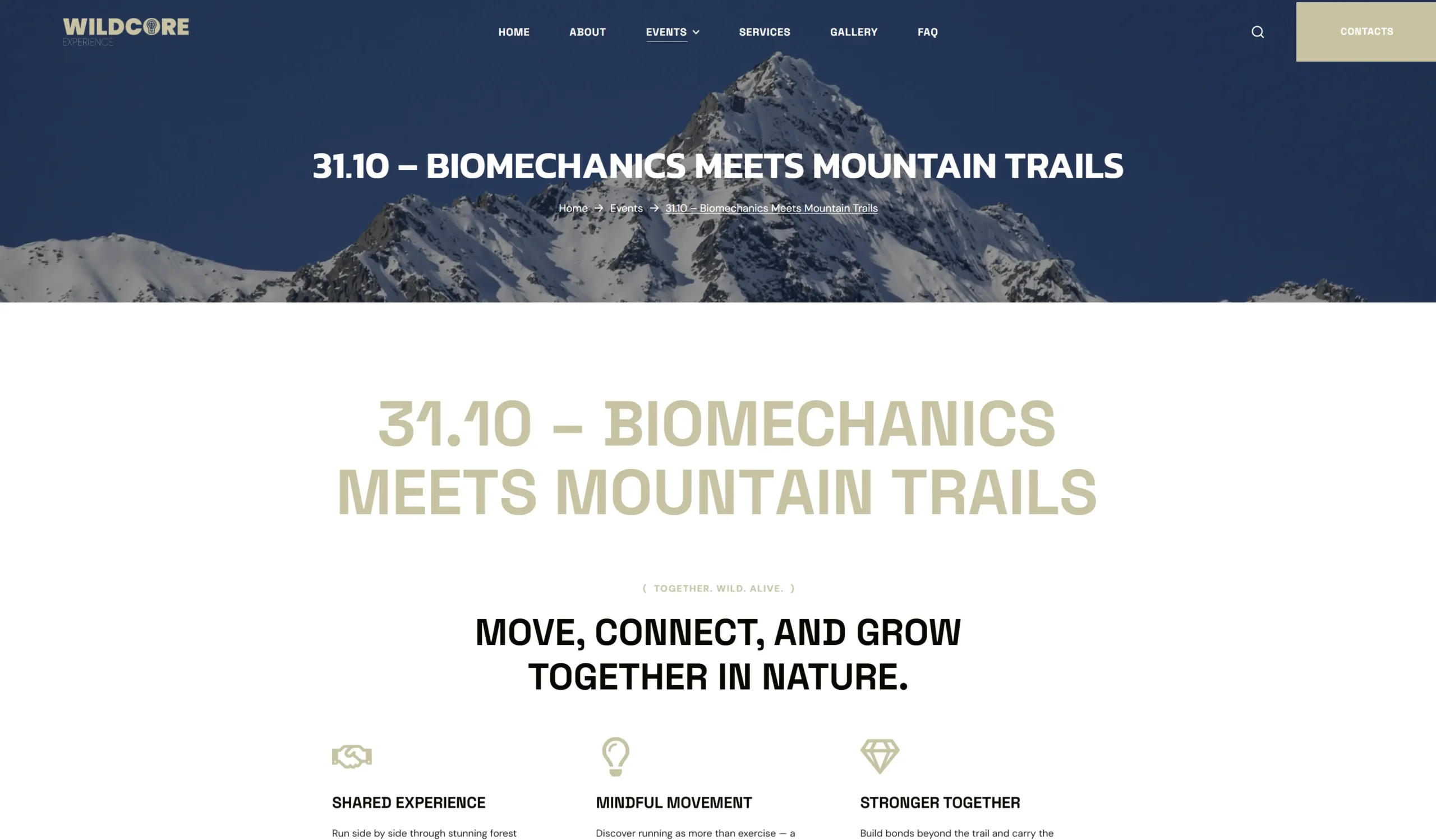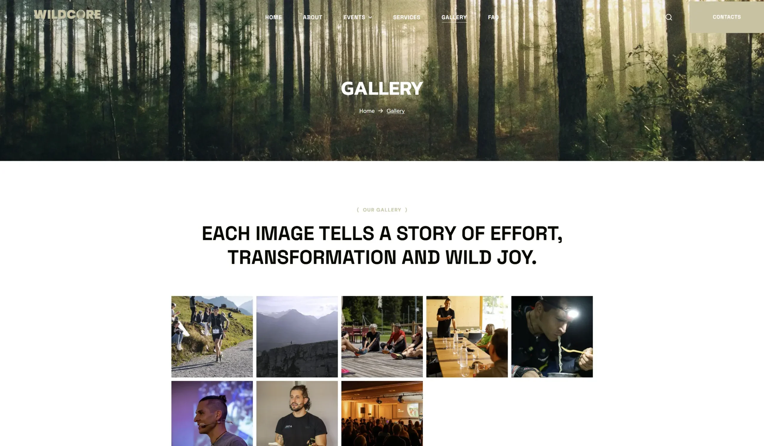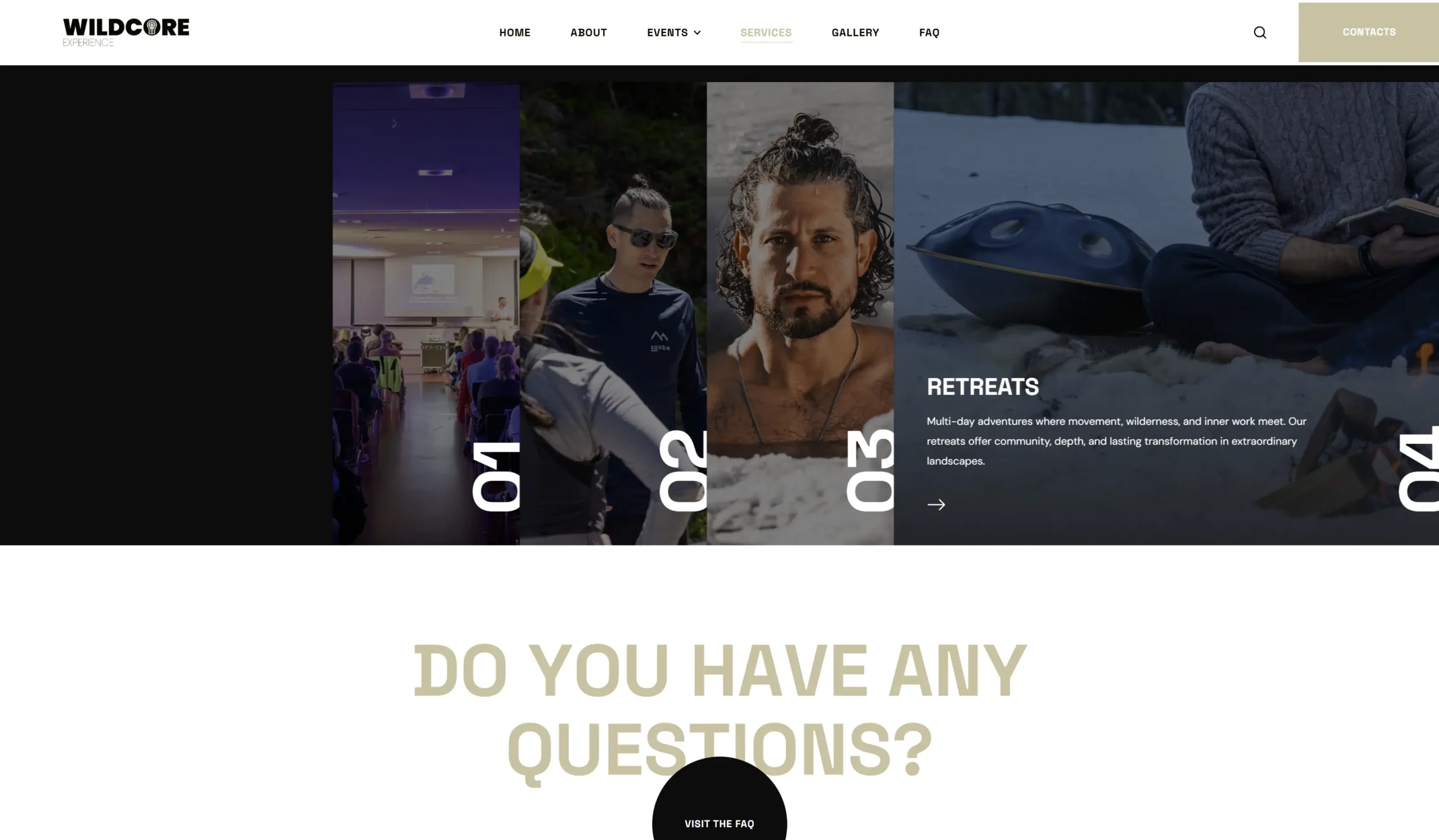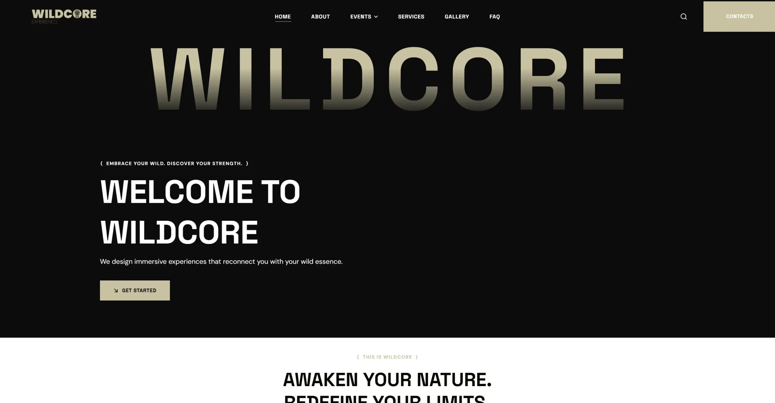 L’estetica del sito riflette il carattere dinamico e autentico di Wildcore, creando un ambiente digitale che rispecchia la potenza e l’energia delle esperienze proposte.